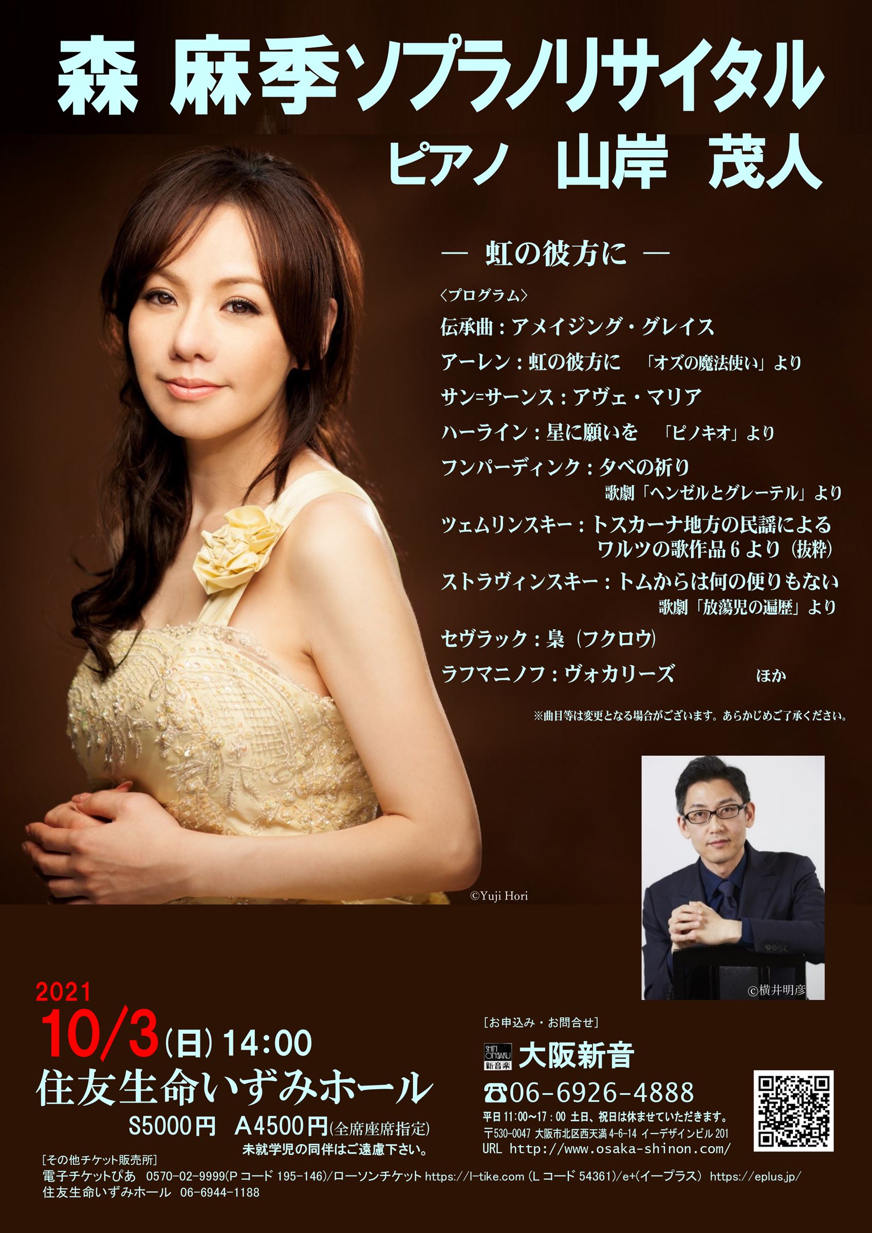 森 麻季ソプラノリサイタル 21/10/3(日) 住友生命いずみホール シェア ツイート 公演情報 ジャンル 声楽 未就学児童は入場不可。 料金 S席-5,000円 A席-4,500円 表示できるチケット情報はありません詳しくはこちら キャスト&スタッフ ソプラノ 森麻季 ピアノ 山岸茂人 お問い合わせ 大阪新音 公式サイト シェア ツイート