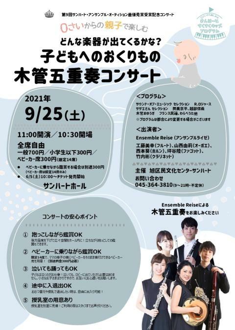 どんな楽器が出てくるかな子どもへのおくりもの木管五重奏コンサート 21/9/25(土) 横浜市旭区民文化センター(サンハート) ホール シェア ツイート 0歳から鑑賞OK!親子で一緒に楽しめる! 公演情報 ジャンル 器楽 室内楽 ベビーカー席ご希望の方は、サンハートまでお問合せください。 料金 全席自由 一般-700円 全自由 小学生以下-300円 表示できるチケット情報はありません詳しくはこちら キャスト&スタッフ 出演:Ensemble Reise お問い合わせ 横浜市旭区民文化センターサンハート 公式サイト シェア ツイート