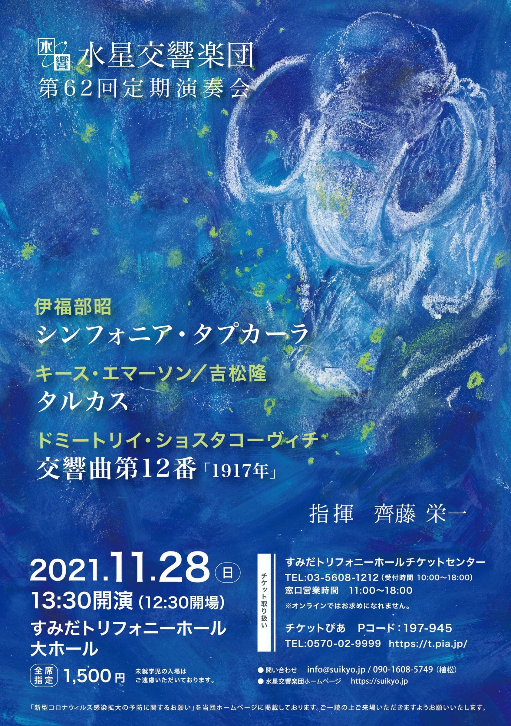 水星交響楽団 第62回定期演奏会 21/11/28(日) すみだトリフォニーホール 大ホール シェア ツイート 伊福部 昭:シンフォニア・タプカーラ/キース・エマーソン(吉松 隆):タルカス/ドミートリイ・ショスタコーヴィチ:交響曲第12番「1917年」 公演情報 ジャンル オーケストラ 未就学児の入場はご遠慮いただいております。新型コロナウイルス感染症拡大防止対策を実施の上、開催いたします。詳細は水星交響楽団ホームページをご確認ください。https://suikyo.jp 料金 全席指定-1,500円 表示できるチケット情報はありません詳しくはこちら キャスト&スタッフ 指揮 齊藤栄一 管弦楽 水星交響楽団 お問い合わせ 植松 公式サイト シェア ツイート
