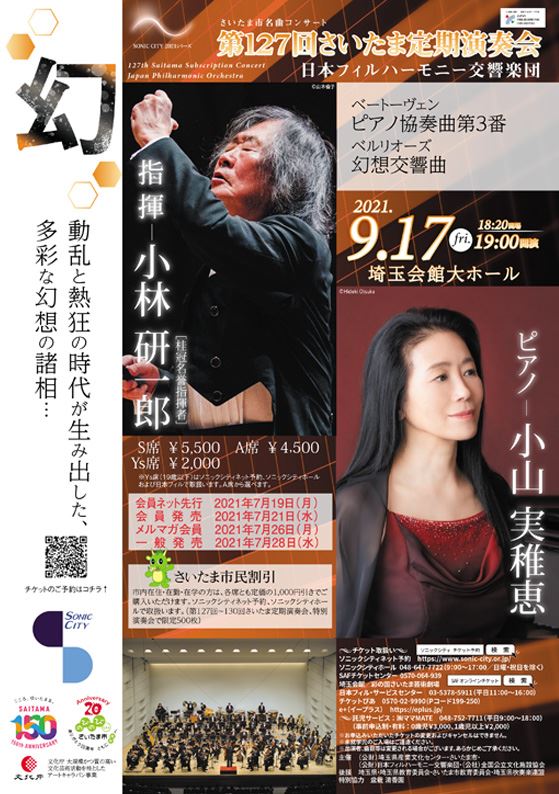 日本フィルハーモニー交響楽団 第127回さいたま定期演奏会 21/9/17(金) 埼玉会館 大ホール シェア ツイート ※開場及び開演時間を1時間前倒しし、20時終演予定にて実施することといたしました。 ベートーヴェン:ピアノ協奏曲第3番/ベルリオーズ:幻想交響曲 公演情報 ジャンル オーケストラ 未就学児童は入場不可。 料金 S席-5,500円 A席-4,500円 表示できるチケット情報はありません詳しくはこちら キャスト&スタッフ 指揮 小林研一郎 管弦楽 日本フィルハーモニー交響楽団 ピアノ 小山実稚恵 お問い合わせ 大宮ソニックシティホール 公式サイト シェア ツイート
