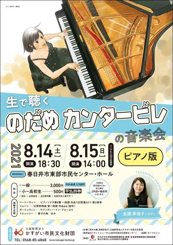 生で聴く"のだめカンタービレ"の音楽会 ピアノ版 21/8/14(土)~21/8/15(日) 春日井市東部市民センター シェア ツイート 春日井で制作し、全国各地で完売続出の大人気公演。ピアノ版は春日井初開催! 公演情報 ジャンル ピアノ・鍵盤楽器 未就学児童は入場不可。小学生のみの入場は不可。 料金 一般-3,000円 学生の特券-500円 学生の特券-高校生以下 表示できるチケット情報はありません詳しくはこちら キャスト&スタッフ ピアノ 高橋多佳子 お問い合わせ かすがい市民文化財団 公式サイト シェア ツイート