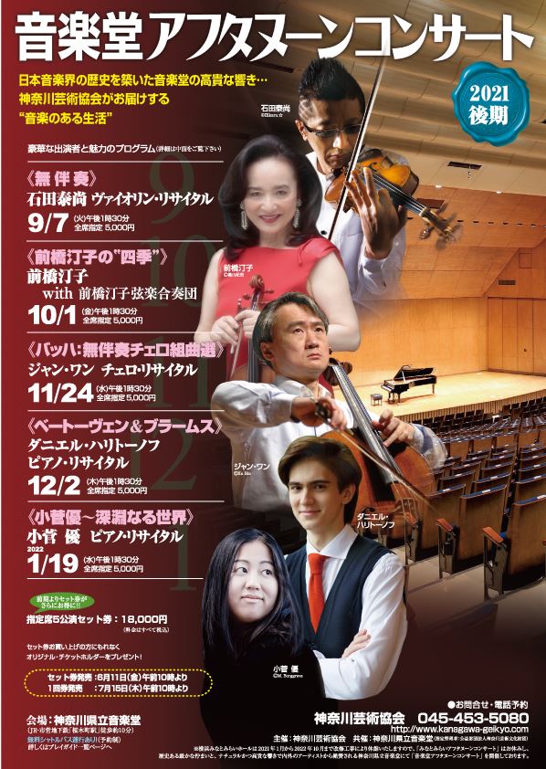 前橋汀子 with 前橋汀子弦楽合奏団/音楽堂アフタヌーンコンサート2021後期 21/10/1(金) 神奈川県立音楽堂(木のホール) シェア ツイート 日本音楽界のパイオニア、前橋汀子の「四季」。若手奏者を中心とした弦楽アンサンブルとともに 公演情報 ジャンル 器楽 室内楽 未就学児童は入場不可。出演者・曲目・曲順は予定のため変更の可能性あり。他に5公演セット券あり、Pコード:781-988参照。 料金 全席指定-5,000円 表示できるチケット情報はありません詳しくはこちら キャスト&スタッフ ヴァイオリン 前橋汀子 弦楽アンサンブル 前橋汀子弦楽合奏団 コンサートマスター 森下幸路 お問い合わせ 神奈川芸術協会 公式サイト シェア ツイート