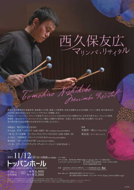 西久保友広 マリンバ・リサイタル 21/11/12(金) トッパンホール シェア ツイート 読売日本交響楽団打楽器奏者、他楽器との共演、後進への指導等、多彩な活躍をみせる打楽器・マリンバ奏者、西久保友広が 2019 年に続き5回目となる「マリンバ・リサイタル」を開催 公演情報 ジャンル ピアノ・鍵盤楽器 器楽 未就学児童は入場不可。新型コロナウイルス感染拡大防止のため、 座席配置、販売席数が通常公演と異なっております。2枚以上申込の場合、お席が離れる可能性がございます。なお、今後の規制緩和に沿い座席を追加販売する場合もございます。公演当日、コロナウイルス感染予防対策を鑑み、マスク着用や開場時の検温などの規制があります。詳細は問合せ先まで。 料金 全席指定 一般-4,000円 全席指定 学生-3,000円 表示できるチケット情報はありません詳しくはこちら キャスト&スタッフ 出演 西久保友広 共演 外囿祥一郎 萱谷亮一 お問い合わせ イチマルマルニ シェア ツイート