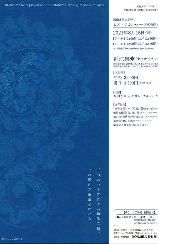 西山まりえが弾くヒストリカル・ハープの植物文様 21/8/15(日) 近江楽堂 シェア ツイート 藤枝守:植物文様ハープ曲集より 植物文様第4集、第11集(中世ゴシック・ハープ)、第27集「台湾茶の植物文様」(ルネサンス・ハープ)、第31集 新作初演(バロック・ハープ) 公演情報 ジャンル 器楽 料金 前売-3,000円当日-3,500円 キャスト&スタッフ ヒストリカル・ハープ:西山まりえ お問い合わせ ムジカキアラ 公式サイト シェア ツイート