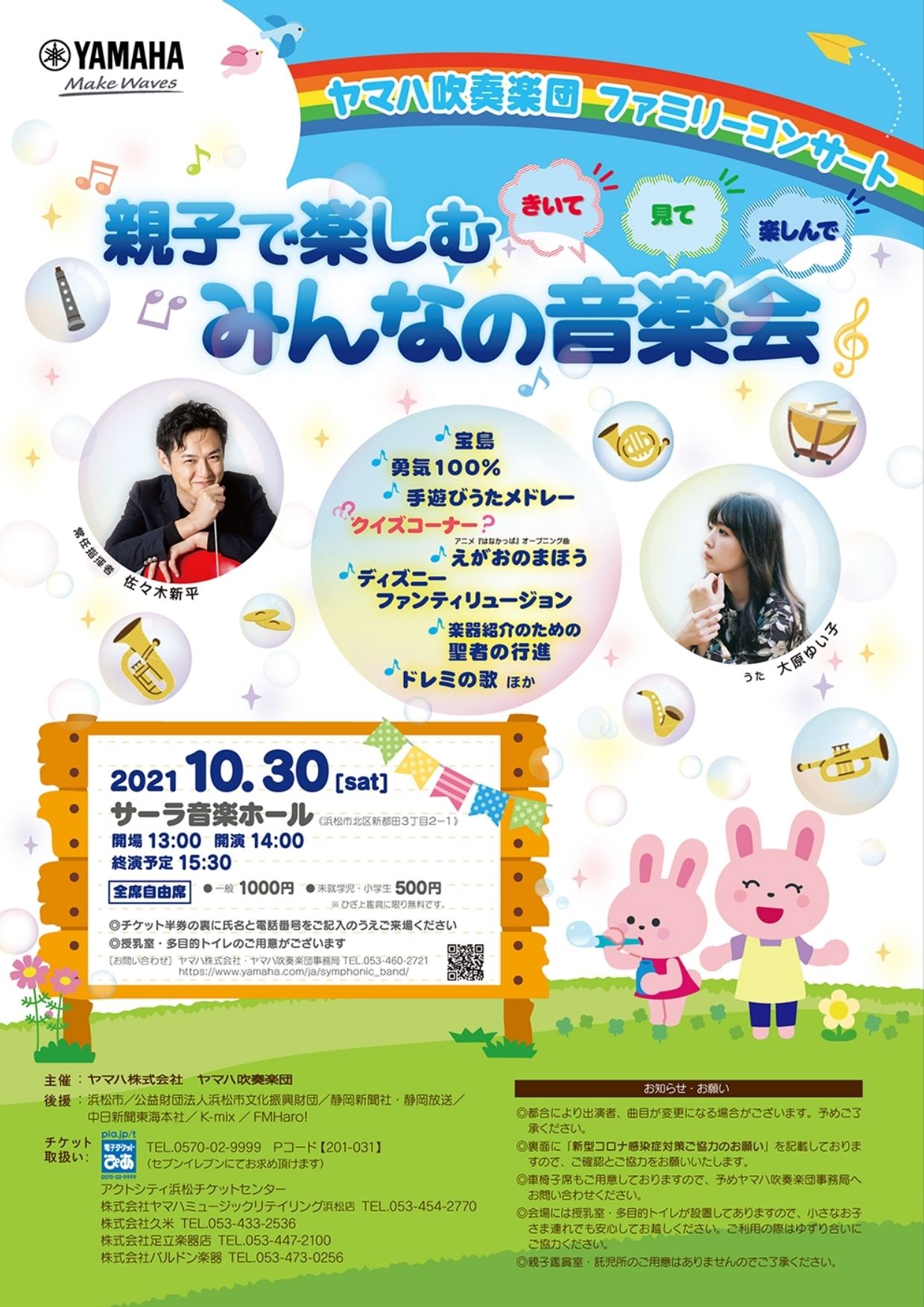 ヤマハ吹奏楽団ファミリーコンサート「親子で楽しむ みんなのおんがく会」 21/10/30(土) サーラ音楽ホール シェア ツイート 公演情報 ジャンル 吹奏楽 3歳以下は、保護者膝上に限り無料。但し、席が必要な場合は有料。事前に必ずお名前・連絡先を右の半券裏側に記入の上、ご来場下さい。 料金 自由席(一般)-1,000円 自由席(小学生以下)-500円 表示できるチケット情報はありません詳しくはこちら キャスト&スタッフ 出演 ヤマハ吹奏楽団 大原ゆい子 指揮 佐々木新平 お問い合わせ ヤマハ吹奏楽団事務局 公式サイト シェア ツイート