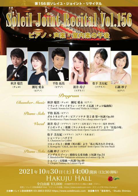 第156回ソレイユ・ジョイント・リサイタル 21/10/30(土) Hakuju Hall シェア ツイート ピアノ・声楽・室内楽の午後 公演情報 ジャンル 室内楽 声楽 ピアノ・鍵盤楽器 未就学児童は入場不可。 料金 全自由-3,000円 表示できるチケット情報はありません詳しくはこちら キャスト&スタッフ 出演 秋津瑞貴 瀬尾愛永 平松拓馬 新井玲子 松下美有紀 石鍋妙子 [出演]秋津瑞貴 / 瀬尾愛永 / 平松拓馬 / 新井玲子 / 松下美有紀 / 石鍋妙子 お問い合わせ ソレイユ音楽事務所 公式サイト シェア ツイート