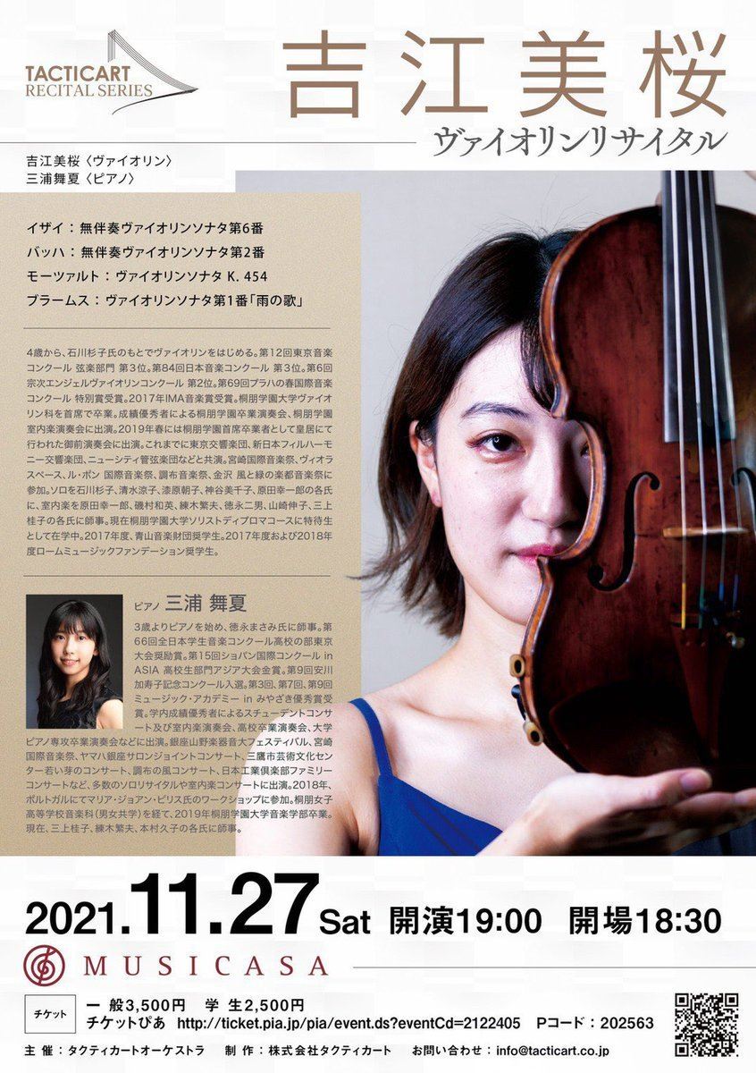 吉江美桜 ヴァイオリンリサイタル 21/11/27(土) ムジカーザ シェア ツイート ブラームス:ヴァイオリンソナタ第1番「雨の歌」/バッハ:無伴奏ヴァイオリンソナタ第2番/モーツァルト:ヴァイオリンソナタ K. 454/イザイ:無伴奏ヴァイオリン第6番 公演情報 ジャンル 器楽 室内楽 料金 全席自由 一般-3,500円 全席自由 学生-2,500円 表示できるチケット情報はありません詳しくはこちら キャスト&スタッフ 出演 吉江美桜 三浦舞夏 お問い合わせ 株式会社タクティカート コンサート事業部 シェア ツイート