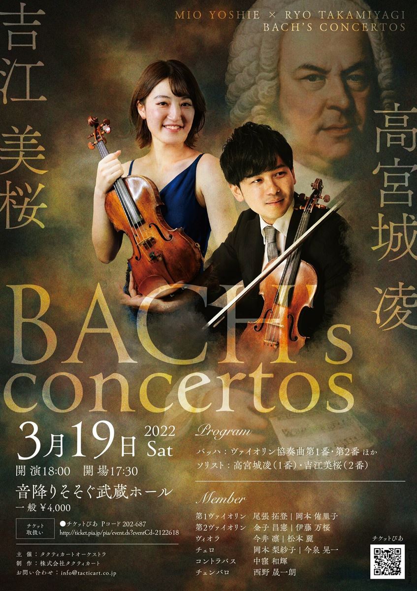 吉江美桜・高宮城凌 Bach's Concertos 22/3/19(土) 音降りそそぐ武蔵ホール シェア ツイート 小編成で挑むバッハ至高のコンチェルト2曲! 公演情報 ジャンル 室内楽 器楽 料金 全席自由-4,000円 表示できるチケット情報はありません詳しくはこちら キャスト&スタッフ 独奏・独唱 吉江美桜 高宮城凌 演奏 尾張拓登 金子昌憲 岡本侑里子 今井凛 松本麗 岡本梨紗子 今泉晃一 中窪和輝 西野晟一朗 お問い合わせ 株式会社タクティカート コンサート事業部 シェア ツイート