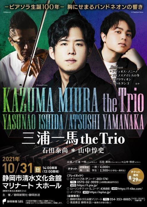三浦一馬 the Trio 21/10/31(日) 静岡市清水文化会館(マリナート) 大ホール シェア ツイート タンゴの革命児。アストル・ピアソラ生誕100年。三浦一馬の胸に迫るバンドネオンの響き 公演情報 ジャンル 器楽 室内楽 学生席は、当日要証明書提示。未就学児童は入場不可。 料金 一般席-4,000円 学生席-2,500円 車椅子席-4,000円 介添席-4,000円 一般席-指定 学生席-指定/高校生以下 車椅子席-整理番号付 介添席-整理番号付 表示できるチケット情報はありません詳しくはこちら キャスト&スタッフ 出演 三浦一馬 山中惇史 石田泰尚 お問い合わせ 静岡新聞社 事業部 公式サイト シェア ツイート
