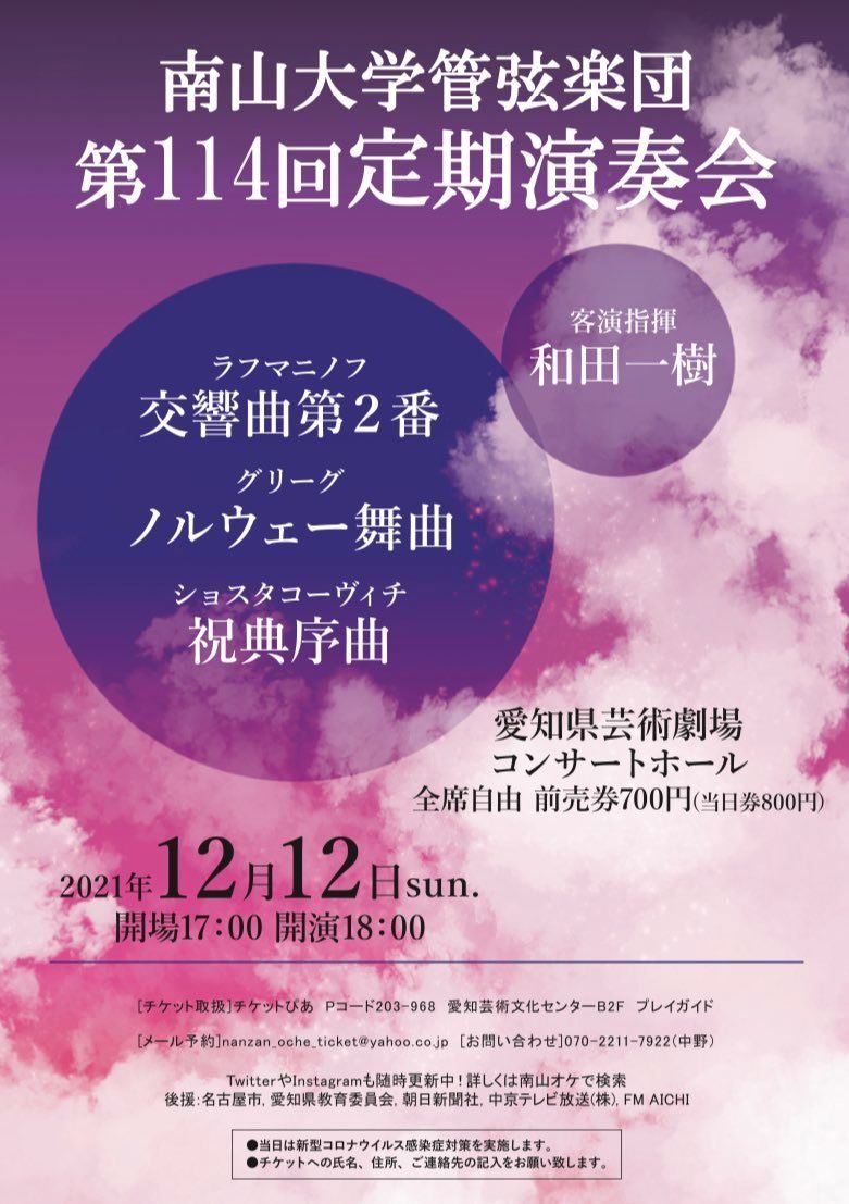 南山大学管弦楽団 第114回定期演奏会 21/12/12(日) 愛知県芸術劇場 コンサートホール シェア ツイート 公演情報 ジャンル オーケストラ 未就学児童は入場不可。 料金 自由席-700円 表示できるチケット情報はありません詳しくはこちら キャスト&スタッフ 指揮 和田一樹 管弦楽 南山大学管弦楽団 お問い合わせ 南山大学管弦楽団(中野) シェア ツイート