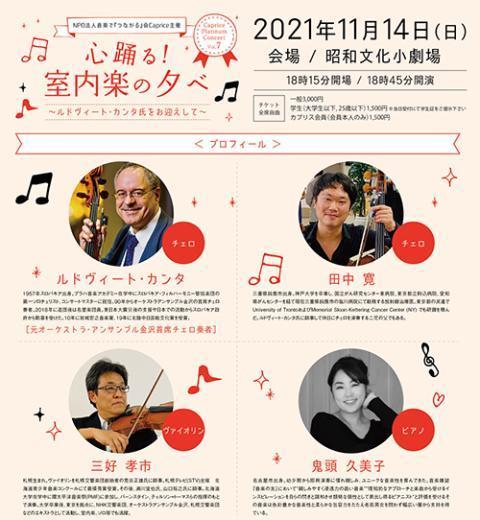 心踊る!室内楽の夕べ~ルドヴィート・カンタ氏をお迎えして~ 21/11/14(日) 名古屋市昭和文化小劇場 シェア ツイート 公演情報 ジャンル 器楽 室内楽 学生券は、当日要証明書提示。 料金 一般-3,000円 学生-1,500円 学生-大学生以下 表示できるチケット情報はありません詳しくはこちら キャスト&スタッフ 出演 ルドヴィート・カンタ 田中寛 三好孝市 鬼頭久美子 お問い合わせ ミュージック・ステーション シェア ツイート