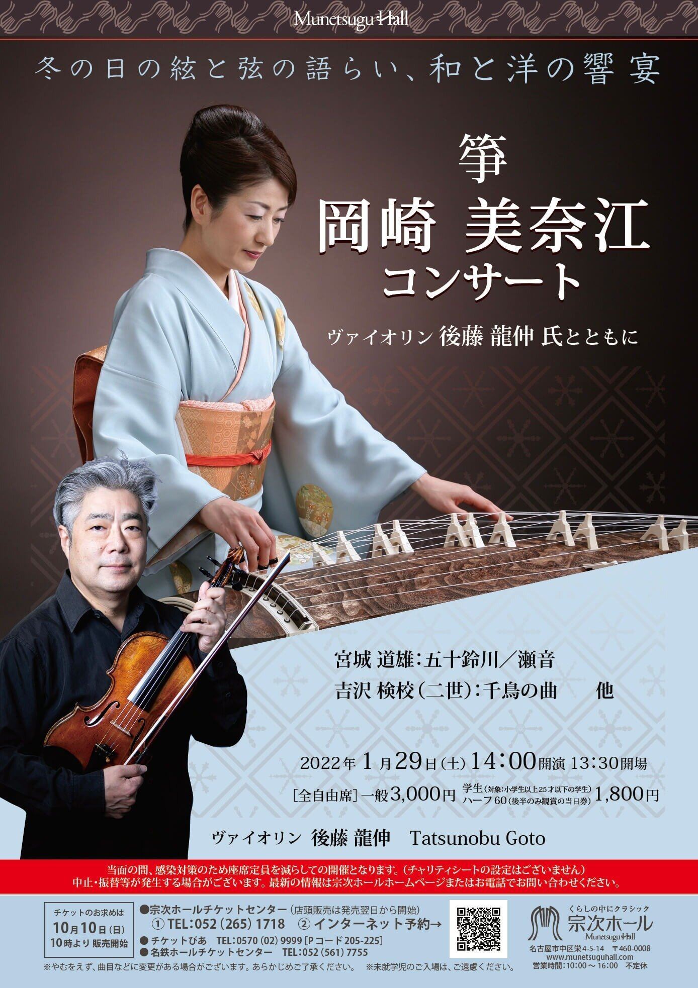 未就学児童は入場不可。当面の間、感染対策として座席定員を減らして販売いたします。マスクを着用しない方の入館はお断りいたします。中止・振替等が発生する場合がございます。最新の情報は宗次ホールホームページまたは問合せ先までご確認ください。コンサート当日は、開場前の混雑・密を回避するための措置として、当日の午前10時より、入場整理番号を配布いたします。開場直後は入場整理番号順にご入場となります。宗次ホールHP(https://munetsuguhall.com/news/general/entry-2478.html)をご来場前に必ずご確認を宜しくお願い致します。