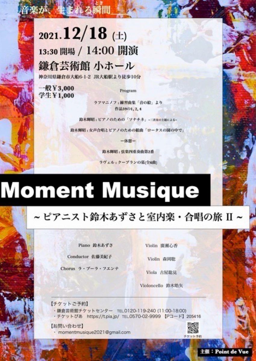 Moment Musique ~ピアニスト鈴木あずさと室内楽・合唱の旅Ⅱ~ 21/12/18(土) 鎌倉芸術館 小ホール シェア ツイート ピアニスト鈴木あずさがソロで、室内楽で、そして合唱との共演で音楽を紡ぎ出す! 公演情報 ジャンル ピアノ・鍵盤楽器 声楽 室内楽 未就学児の入場はご遠慮下さい。 料金 全席自由 一般-3,000円 全席自由 学生-1,000円 表示できるチケット情報はありません詳しくはこちら キャスト&スタッフ 出演 鈴木あずさ 廣瀬心香 古屋聡見 鈴木皓矢 森岡聡 佐藤美紀子 お問い合わせ 鎌倉芸術館チケットセンター シェア ツイート
