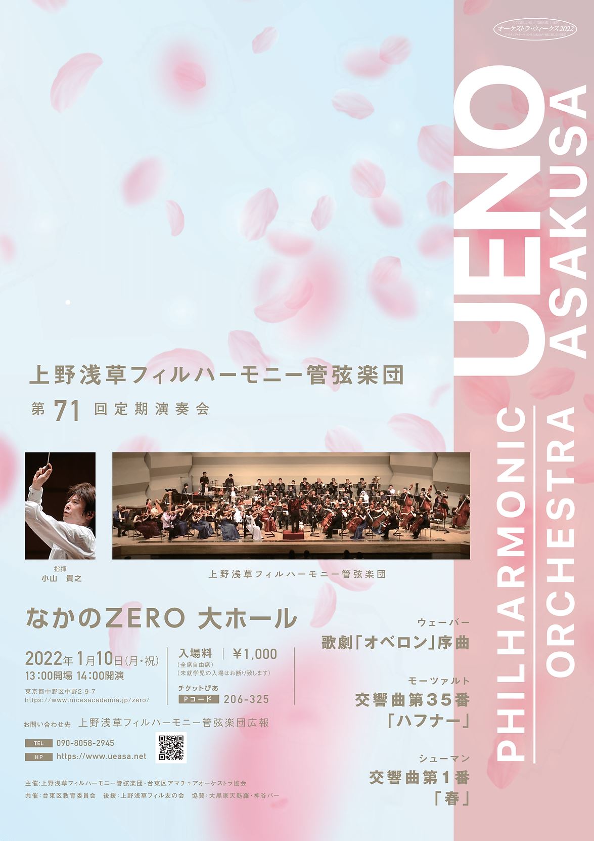 上野浅草フィルハーモニー管弦楽団 第71回記念演奏会 22/1/10(月) なかのZERO 大ホール シェア ツイート ウェーバー:「オベロン」序曲/モーツァルト:交響曲第35番「ハフナー」/シューマン:交響曲第1番「春」 公演情報 ジャンル オーケストラ 未就学児童は入場不可。 料金 前売-1,000円 表示できるチケット情報はありません詳しくはこちら キャスト&スタッフ 指揮 小山貴之 管弦楽 上野浅草フィルハーモニー管弦楽団 お問い合わせ 上野浅草フィルハーモニー管弦楽団広報 公式サイト シェア ツイート