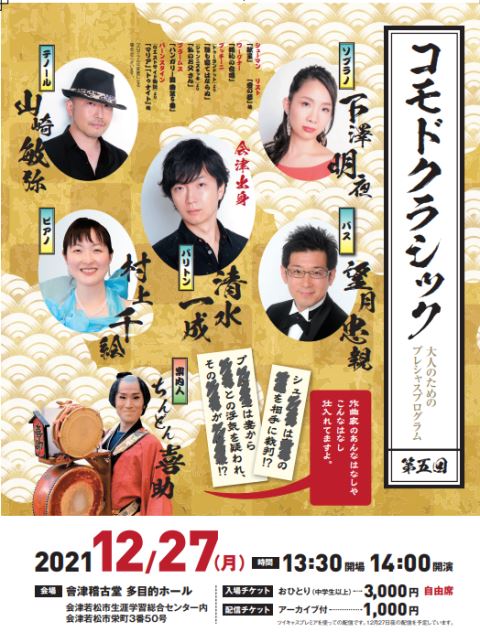 コモドクラシック 会津公演 大人のためのプレシャスプログラム 21/12/27(月) 会津若松市生涯学習総合センター 會津稽古堂 シェア ツイート 作曲家にまつわるちょっとスキャンダルなお話と歌のコンサートです。 公演情報 ジャンル 声楽 オペラ 中止・延期以外の払戻は不可です。ツイキャスが見れなかった等での払戻、返金はありません。都合により、出演者やプログラムに変更がある場合もございます。あらかじめご了承ください。ご来場の際はマスクのご着用をお願いいたします。入場時に検温をいたします。37.5度以上の発熱がある場合は入場をお断りいたします。 料金 おひとり(中学生以上)-3,000円 表示できるチケット情報はありません詳しくはこちら キャスト&スタッフ 出演 清水一成 下澤明夜 山崎敏弥 望月忠親 村上千絵 ちんどん喜助 [出演]清水一成 / 下澤明夜 / 山崎敏弥 / 望月忠親 / 村上千絵 / ちんどん喜助 お問い合わせ CCカンパニー シェア ツイート