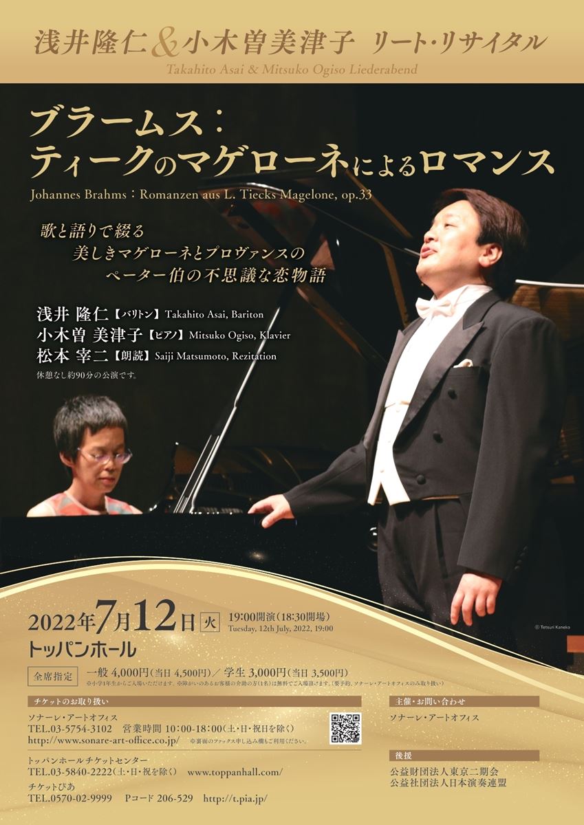 浅井隆仁&小木曽美津子 リート・リサイタル 22/7/12(火) トッパンホール シェア ツイート ブラームス:ティークのマゲローネによるロマンス 公演情報 ジャンル 声楽 ・障がいのあるお客様の、介助の方(1名)は無料でご入場いただけます。(要予約) ・介助者ご同伴チケットは、ソナーレ・アートオフィスのみのお取り扱いとなります。 ・小学1年生からご入場いただけます。 料金 全席指定一般-4,000円 全席指定学生-3,000円 表示できるチケット情報はありません詳しくはこちら キャスト&スタッフ バリトン 浅井隆仁 ピアノ 小木曽美津子 朗読 松本宰二 お問い合わせ 有限会社ソナーレ・アートオフィス 公式サイト シェア ツイート