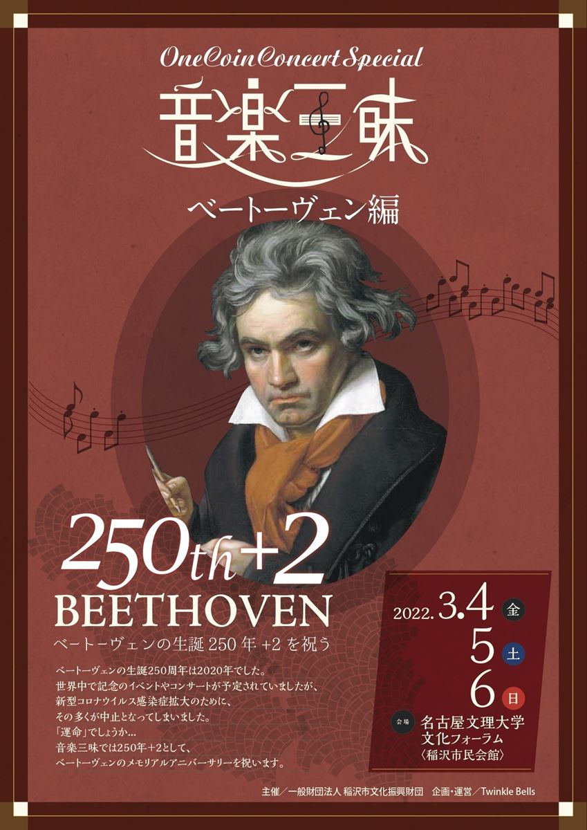 ワンコインコンサートスペシャル音楽三昧 ~ベートーヴェン編~ 250th+2 22/3/4(金)~22/3/6(日) 名古屋文理大学文化フォーラム 中ホール、名古屋文理大学文化フォーラム 大ホール シェア ツイート 公演情報 ジャンル フェスティバル 1歳以上有料。1歳未満は、席が必要な場合は有料。 料金 全席自由-500円 全席自由-1,000円 表示できるチケット情報はありません詳しくはこちら お問い合わせ 名古屋文理大学文化フォーラム(稲沢市民会館) 公式サイト シェア ツイート