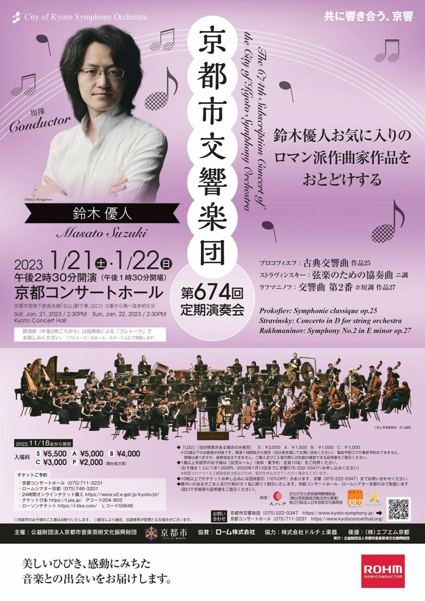 京都市交響楽団 第674回定期演奏会 23/1/21(土)~23/1/22(日) 京都コンサートホール 大ホール シェア ツイート プロコフィエフ:古典交響曲 作品25/ストラヴィンスキー:弦楽のための協奏曲 二調/ラフマニノフ:交響曲 第2番 ホ短調 作品27 公演情報 ジャンル オーケストラ 未就学児童は入場不可。 料金 S席-5,500円 A席-5,000円 B席-4,000円 C席-3,000円 P席-2,000円 表示できるチケット情報はありません詳しくはこちら キャスト&スタッフ 指揮 鈴木優人 管弦楽 京都市交響楽団 お問い合わせ 京都市交響楽団 公式サイト シェア ツイート