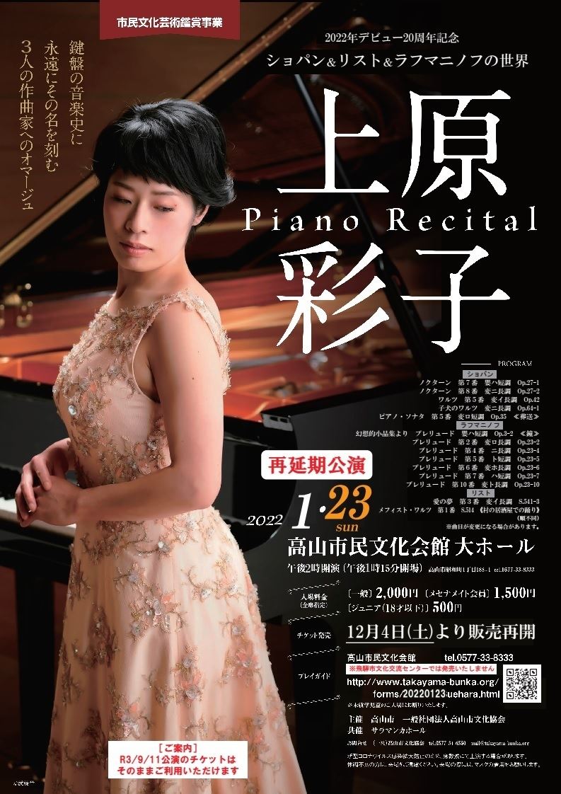 上原彩子ピアノ・リサイタル 22/1/23(日) 高山市民文化会館 大ホール シェア ツイート 2022年デビュー20周年記念。ショパン&リスト&ラフマニノフの世界。鍵盤の音楽史に永遠にその名を刻む3人の作曲家へのオマージュ。 公演情報 ジャンル ピアノ・鍵盤楽器 未就学児童は入場不可。 料金 一般-2,000円 ジュニア(18才以下)-500円 表示できるチケット情報はありません詳しくはこちら キャスト&スタッフ ピアノ 上原彩子 お問い合わせ 高山市文化協会 公式サイト シェア ツイート