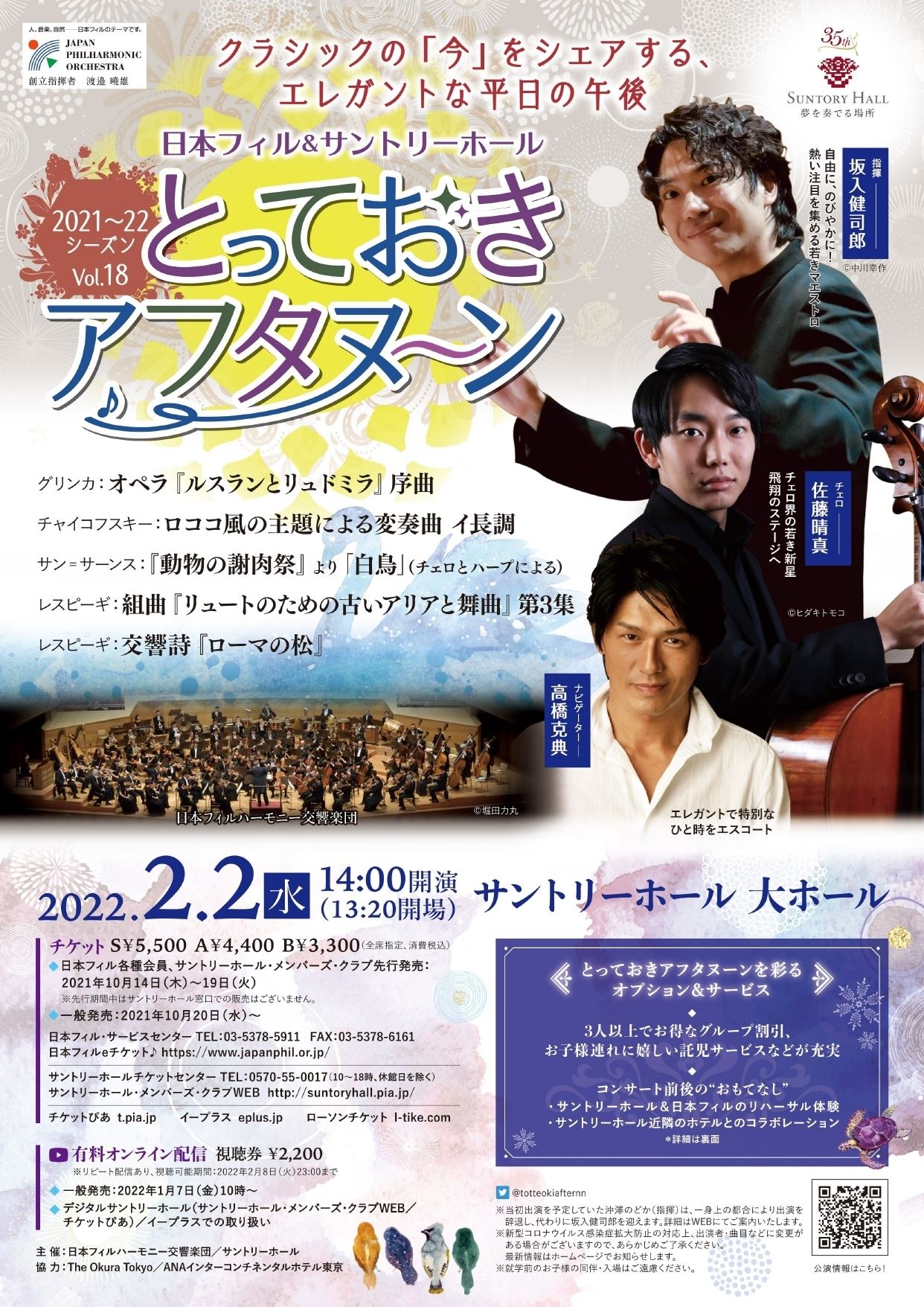 【動画配信】日本フィル&サントリーホール とっておきアフタヌーン Vol.18 22/2/2(水)~22/2/8(火) PIA LIVE STREAM シェア ツイート 公演情報 ジャンル オーケストラ この公演はオンライン動画配信でのみご覧いただけます。配信時間・出演者は予定のため変更の可能性あり。公演に関する詳細は問合せ先まで。 料金 視聴券-2,200円 表示できるチケット情報はありません詳しくはこちら キャスト&スタッフ メイン 動画配信 指揮 坂入健司郎 チェロ 佐藤晴真 司会 高橋克典 演奏 日本フィルハーモニー交響楽団 お問い合わせ サントリーホールチケットセンター シェア ツイート