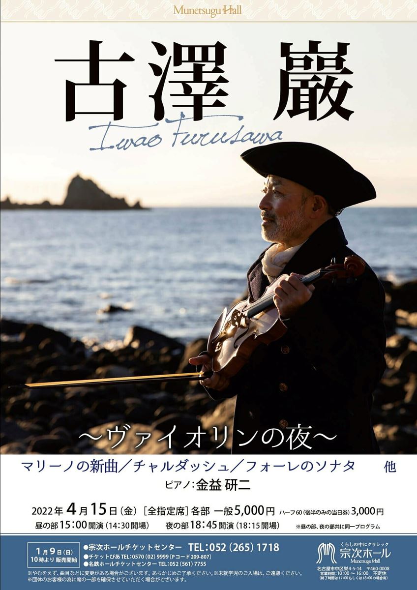 古澤巖 ~ヴァイオリンの昼と夜~ 22/4/15(金) 宗次ホール シェア ツイート 公演情報 ジャンル 器楽 未就学児童は入場不可。マスクを着用しない方の入館はお断りいたします。公演開催についての最新情報は宗次ホールホームページまたは問合せ先までご確認ください。感染対策/座席定員/中止・振替等についてhttps://munetsuguhall.com/news/ 入場整理番号についてhttps://munetsuguhall.com/news/general/entry-2478.html ご確認の上、ご来場いただきますようお願い致します。 料金 指定-5,000円 表示できるチケット情報はありません詳しくはこちら キャスト&スタッフ ヴァイオリン 古澤巖 ピアノ 金益研二 お問い合わせ 宗次ホールチケットセンター 公式サイト シェア ツイート