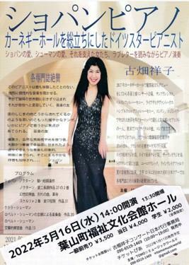 ショパンの愛、シューマンの愛、古畑祥子ショパンピアノ 22/3/16(水) 葉山町福祉文化会館 シェア ツイート カーネギーホールを総立ちにしたドイツスターピアニスト 公演情報 ジャンル ピアノ・鍵盤楽器 4歳以上はチケット必要。3歳以下でも席が必要な場合はチケット必要。やむを得ない事情により公演が延期又は中止となる場合がございます。ご自宅で検温を済ませてマスク着用の上ご入館下さい。 料金 全席指定一般-3,500円 全席指定学生-2,000円 表示できるチケット情報はありません詳しくはこちら キャスト&スタッフ 出演 古畑祥子 お問い合わせ TOMO☆ミュージックワールド シェア ツイート