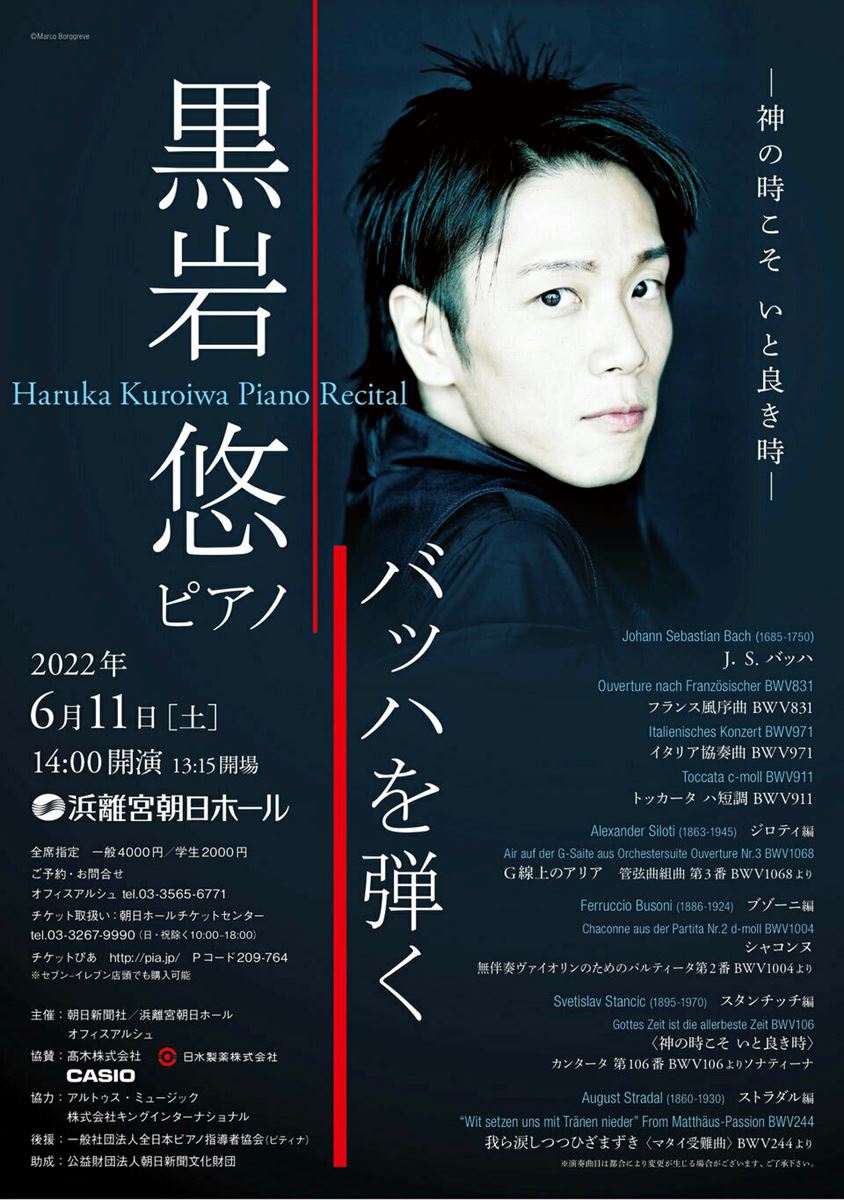 黒岩悠(p) 22/6/11(土) 浜離宮朝日ホール シェア ツイート バッハを弾く /神の時こそ いと良き時 公演情報 ジャンル ピアノ・鍵盤楽器 料金 全席指定・一般-4,000円 全席指定・学生-2,000円 表示できるチケット情報はありません詳しくはこちら キャスト&スタッフ ピアノ 黒岩悠 お問い合わせ オフィスアルシュ 公式サイト シェア ツイート