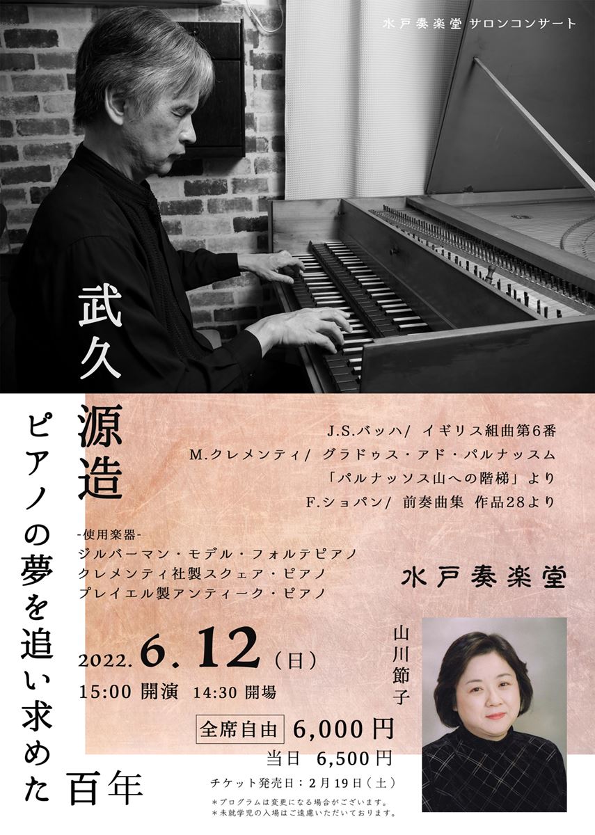 武久源造 ~ピアノの夢を追い求めた百年~ 22/6/12(日) 水戸奏楽堂 シェア ツイート J.S.バッハ:イギリス組曲第6番/M.クレメンティ:グラドゥス・アド・パルナッスム、「パルナッソス山への階梯」より/F.ショパン:前奏曲集 作品28より 公演情報 ジャンル ピアノ・鍵盤楽器 未就学児童は入場不可 料金 全席自由-6,000円 表示できるチケット情報はありません詳しくはこちら キャスト&スタッフ ピアノ 武久源造 山川節子 お問い合わせ 水戸奏楽堂 公式サイト シェア ツイート
