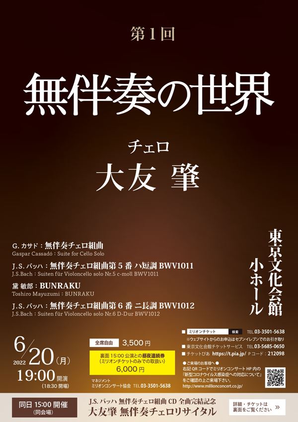 第1回 無伴奏の世界 22/6/20(月) 東京文化会館 小ホール シェア ツイート G.カサド:無伴奏チェロ組曲/J.S.バッハ:無伴奏チェロ組曲 第5番 ハ短調 BWV1011/黛敏郎:BUNRAKU/J.S.バッハ:無伴奏チェロ組曲 第6番 ニ長調 BWV1012 公演情報 ジャンル 室内楽 器楽 料金 全席自由-3,500円 表示できるチケット情報はありません詳しくはこちら キャスト&スタッフ 出演 大友肇 お問い合わせ (株)ミリオンコンサート協会 公式サイト シェア ツイート
