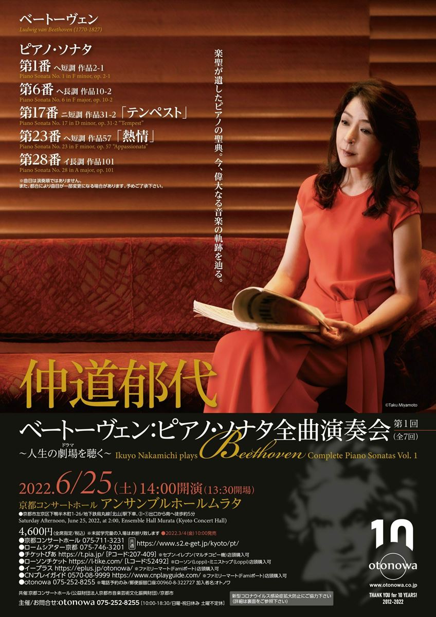 仲道郁代 ベートーヴェン:ピアノ・ソナタ全曲演奏会 第1回(全7回)~人生の劇場(ドラマ)を聴く~ 22/6/25(土) 京都コンサートホール 小ホール シェア ツイート 楽聖が遺したピアノの聖典。今、偉大なる音楽の軌跡を辿る。 公演情報 ジャンル ピアノ・鍵盤楽器 未就学児童は入場不可。ご購入の際は、氏名と電話番号を必ずご登録下さい。来場者から新型コロナウイルス感染者が発生した場合、登録された情報は保健所等の公的機関へ提供されます。予めご了承下さい。曲目・曲順は変更になる場合があります。 料金 全席指定-4,600円 表示できるチケット情報はありません詳しくはこちら キャスト&スタッフ ピアノ 仲道郁代 お問い合わせ オトノワ 公式サイト シェア ツイート