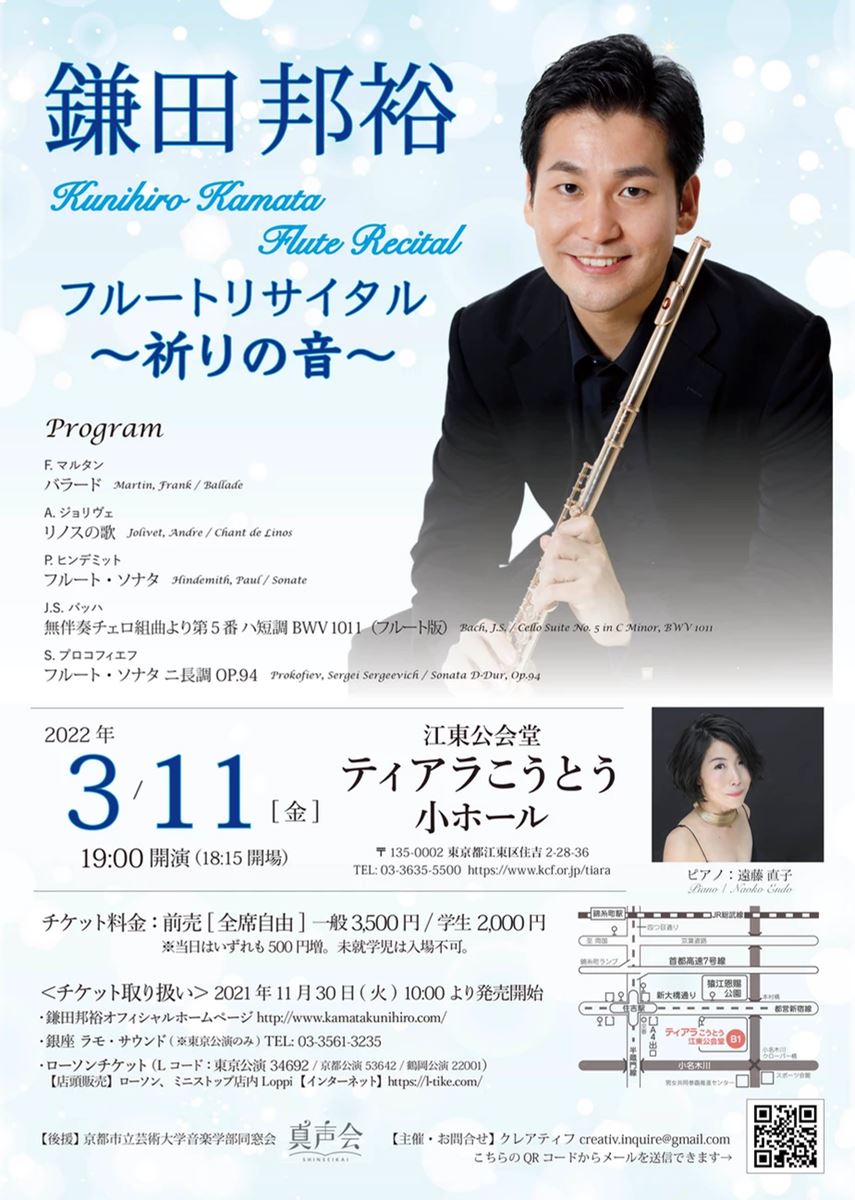 鎌田邦裕フルートリサイタル〜祈りの音〜 22/3/11(金) ティアラこうとう 小ホール シェア ツイート マルタン:バラード/ジョリヴェ:リノスの歌/ヒンデミット:フルート・ソナタ/J.S.バッハ:無伴奏チェロ組曲より第5番 ハ短調 BWV1011(フルート版)/プロコフィエフ:フルート・ソナタ ニ長調 Op.94 公演情報 ジャンル 器楽 料金 全席自由一般-3,500円学生-2,000円 キャスト&スタッフ フルート 鎌田邦裕 ピアノ 遠藤直子 お問い合わせ クレアティフ 公式サイト シェア ツイート