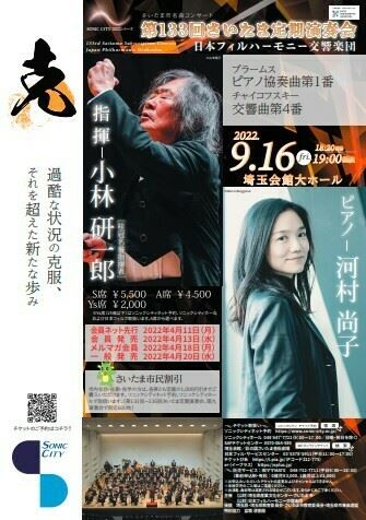 日本フィルハーモニー交響楽団 第133回さいたま定期演奏会 22/9/16(金) 埼玉会館 大ホール シェア ツイート ブラームス:ピアノ協奏曲第1番 ニ短調 op.15/チャイコフスキー:交響曲第4番 ヘ短調 op.36 公演情報 ジャンル オーケストラ 未就学児童は入場不可。 料金 S席-5,500円 A席-4,500円 表示できるチケット情報はありません詳しくはこちら キャスト&スタッフ 指揮 小林研一郎 管弦楽 日本フィルハーモニー交響楽団 ピアノ 河村尚子 お問い合わせ 大宮ソニックシティホール 公式サイト シェア ツイート
