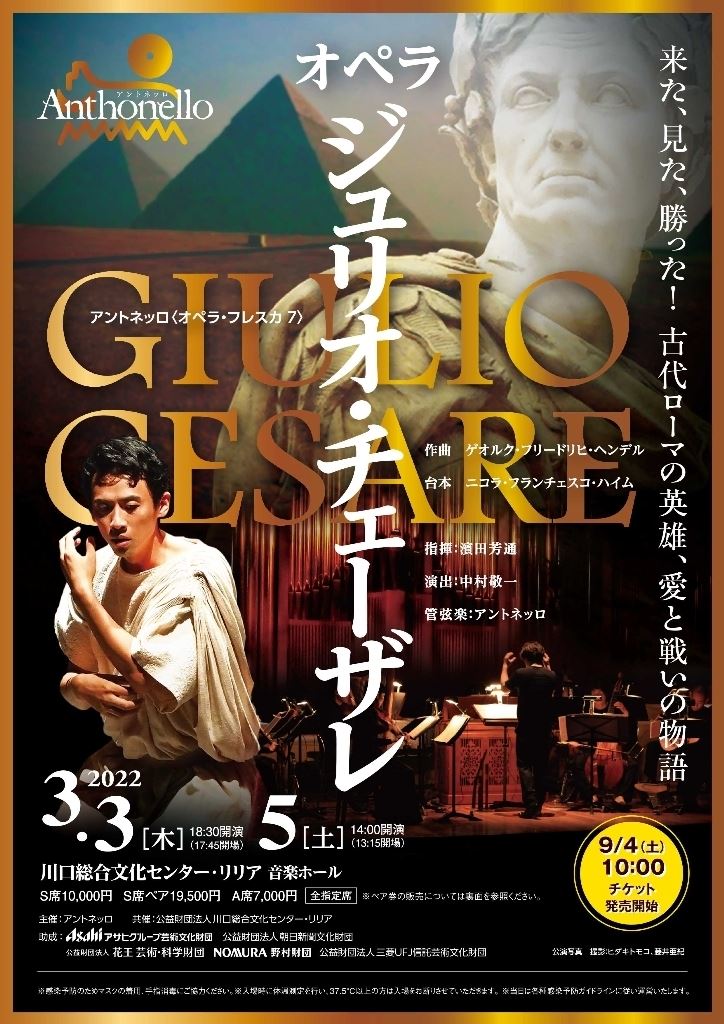 <オペラ・フレスカ7>G.F.ヘンデル作曲 オペラ『ジュリオ・チェーザレ』 22/3/3(木)~22/3/5(土) 川口総合文化センター リリア4階 音楽ホール シェア ツイート G.F.ヘンデル:オペラ『ジュリオ・チェーザレ』(原語上演字幕付き) 公演情報 ジャンル オペラ 声楽 料金 全指定席 S席-10,000円S席ペア-19,500円A席-7,000円 キャスト&スタッフ 指揮 濱田芳通 演出 中村敬一 管弦楽 アントネッロ 公式サイト シェア ツイート
