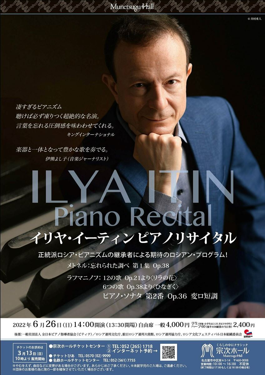 イリヤ・イーティン ピアノリサイタル 22/6/26(日) 宗次ホール シェア ツイート メトネル:忘れられた調べ 第1集 Op.38/ラフマニノフ:12の歌 Op.21より〈リラの花〉、6つの歌 Op.38より〈ひなぎく〉、ピアノ・ソナタ 第2番 Op.36 変ロ短調 公演情報 ジャンル ピアノ・鍵盤楽器 未就学児童は入場不可。マスクを着用しない方の入館はお断りいたします。公演開催についての最新情報は宗次ホールホームページまたは問合せ先までご確認ください。感染対策/座席定員/中止・振替等についてhttps://munetsuguhall.com/news/ 入場整理番号についてhttps://munetsuguhall.com/news/general/entry-2478.html ご確認の上、ご来場いただきますようお願い致します。 料金 自由-4,000円 表示できるチケット情報はありません詳しくはこちら キャスト&スタッフ ピアノ イリヤ・イーティン お問い合わせ 宗次ホールチケットセンター 公式サイト シェア ツイート