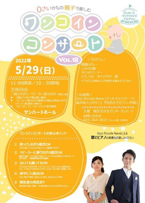 0さいから親子で楽しむワンコインコンサートVol.18 22/5/29(日) 横浜市旭区民文化センター(サンハート) ホール シェア ツイート サンハート・アンサンブル・オーディションにて優秀賞を受賞したアーティストによるワンコインコンサート 公演情報 ジャンル ピアノ・鍵盤楽器 声楽 2歳以下は膝上無料。座席が必要なお子様はチケットをお買い求めください。ベビーカー席ご希望の方は、サンハートまでお問合せください。 料金 全席自由-500円 表示できるチケット情報はありません詳しくはこちら お問い合わせ 横浜市旭区民文化センターサンハート シェア ツイート