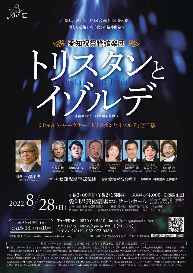 本公演に関するお問合せは、愛知祝祭管弦楽団・スタジオフォンテーヌ[mail]sucre-fontaine@abelia.ocn.ne.jpまで。未就学児童は入場不可。ご来場にはマスクの着用必須、検温(37.5度以上入場不可)・手洗い・消毒など十分な感染予防をお願いいたします。発熱や体調不良の場合はご来場をお控えください。やむを得ぬ事情により曲目等が変更になる場合がございます。あらかじめご了承ください。出演者へのお花、プレゼントはご辞退申し上げます。