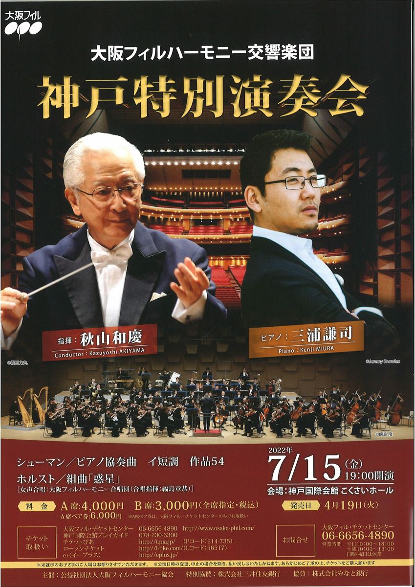 大阪フィルハーモニー交響楽団 神戸特別演奏会 22/7/15(金) 神戸国際会館こくさいホール シェア ツイート シューマン:ピアノ協奏曲 イ短調 作品54/ホルスト:組曲「惑星」 公演情報 ジャンル オーケストラ 未就学児童は入場不可。 料金 A席-4,000円 B席-3,000円 表示できるチケット情報はありません詳しくはこちら キャスト&スタッフ 指揮 秋山和慶 管弦楽 大阪フィルハーモニー交響楽団 ピアノ 三浦謙司 女声合唱 大阪フィルハーモニー合唱団 お問い合わせ 大阪フィル・チケットセンター 公式サイト シェア ツイート