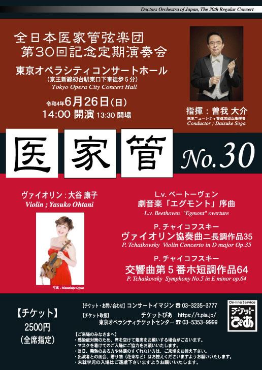 全日本医家管弦楽団 第30回記念定期演奏会 22/6/26(日) 東京オペラシティ コンサートホール:タケミツメモリアル シェア ツイート ベートーヴェン:「エグモント」序曲/チャイコフスキー:ヴァイオリン協奏曲/チャイコフスキー:交響曲第5番ホ短調 公演情報 ジャンル オーケストラ 料金 全席指定-2,500円 表示できるチケット情報はありません詳しくはこちら キャスト&スタッフ 指揮 曽我大介 管弦楽 全日本医家管弦楽団 ヴァイオリン 大谷康子 お問い合わせ コンサートイマジン 公式サイト シェア ツイート