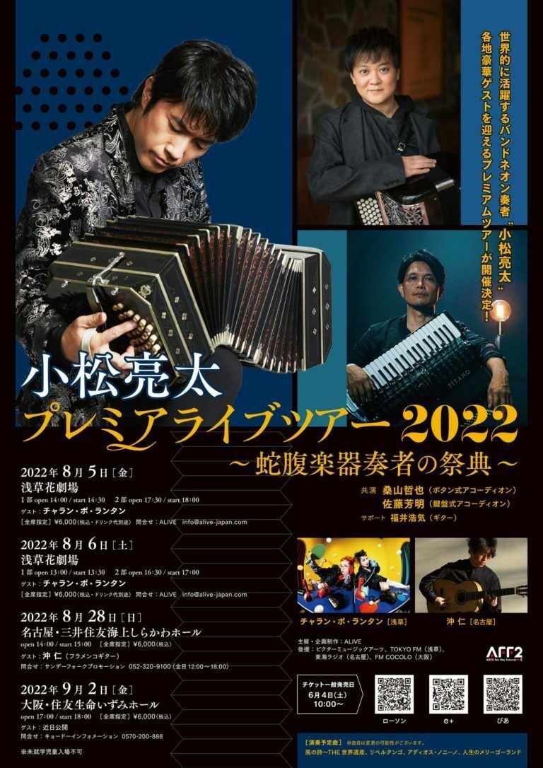 小松亮太 プレミアムライブツアー2022~蛇腹楽器演奏者の祭典~ 22/8/28(日) 三井住友海上しらかわホール シェア ツイート 公演情報 ジャンル ピアノ・鍵盤楽器 2階以上の最前列は、安全確保のため、着席での観覧をお願いしておりますのでご了承ください。未就学児童は入場不可。 料金 全席指定-6,000円 表示できるチケット情報はありません詳しくはこちら キャスト&スタッフ 出演 小松亮太 共演 桑山哲也 佐藤芳明 福井浩気 お問い合わせ サンデーフォークプロモーション 公式サイト シェア ツイート