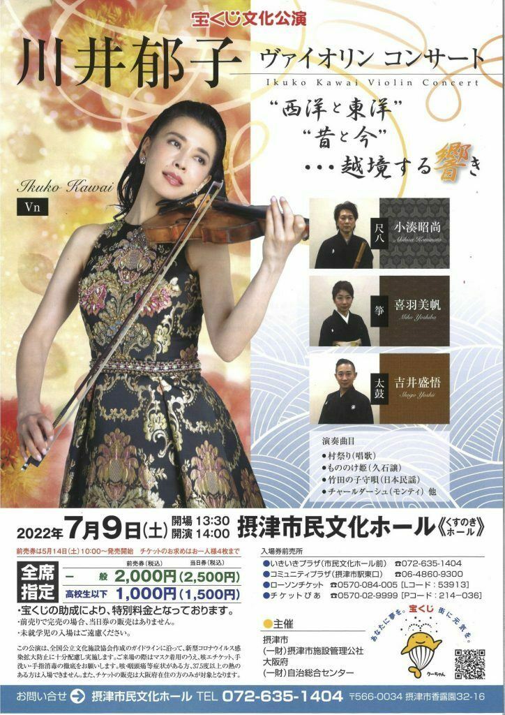 川井郁子ヴァイオリンコンサート 22/7/9(土) 摂津市民文化ホール シェア ツイート “西洋と東洋”“昔と今”・・・越境する響き 公演情報 ジャンル 室内楽 器楽 未就学児童は入場不可。新型コロナウイルス感染拡大防止のため、検温、手指消毒及びマスクの着用をお願いいたします。 料金 全席指定 一般-2,000円 全席指定 高校生以下-1,000円 表示できるチケット情報はありません詳しくはこちら キャスト&スタッフ 出演 川井郁子 お問い合わせ 摂津市民文化ホール 公式サイト シェア ツイート