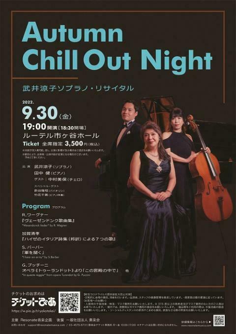 Automn Chill Out Night ~武井涼子 ソプラノ・リサイタル~ 22/9/30(金) ルーテル市ヶ谷ホール シェア ツイート 公演情報 ジャンル 声楽 公演に関する詳細はsupport@resonatemusica.comまで。 料金 全席指定-3,500円 表示できるチケット情報はありません詳しくはこちら キャスト&スタッフ 出演 武井涼子 田中健 ゲスト 中村美保 酢谷隆昭 伴奏 竹花千景 お問い合わせ 奏楽会 シェア ツイート