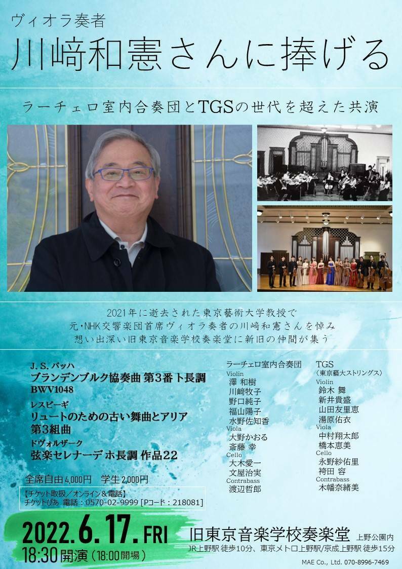 ヴィオラ奏者・川崎和憲さんに捧げる 22/6/17(金) 旧東京音楽学校奏楽堂 シェア ツイート ラローチェ室内合奏団とTGSの世代を超えた共演 公演情報 ジャンル 室内楽 器楽 料金 全席自由 一般-4,000円 全席自由 学生-2,000円 表示できるチケット情報はありません詳しくはこちら キャスト&スタッフ 出演 澤和樹 川崎牧子 野口純子 福山陽子 水野佐知香 新井貴盛 鈴木舞 山田友里恵 湯原佑衣 大野かおる 斎藤幸 中村翔太郎 橋本恵美 大木愛一 文屋治実 永野紗佑里 袴田容 渡辺哲郎 木幡奈緒美 お問い合わせ 株式会社MAE シェア ツイート