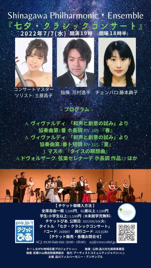 七夕・クラシックコンサート 22/7/7(木) スクエア荏原(品川区立荏原平塚総合区民会館) ひらつかホール シェア ツイート 七夕にちなんで、願いを込めて、ヴィヴァルディの「四季」より「夏」ほか 公演情報 ジャンル 室内楽 器楽 未就学児入場可(無料)。シニア対象年齢は65歳以上。 料金 全席自由 一般-2,500円 全席自由 シニア-1,500円 全席自由 学生-1,500円 表示できるチケット情報はありません詳しくはこちら キャスト&スタッフ 指揮 河村逸平 出演 品川フィルハーモニー・アンサンブル 土屋昌子 藤本典子 お問い合わせ アーティストコミュニティジャパン(ACJ) シェア ツイート