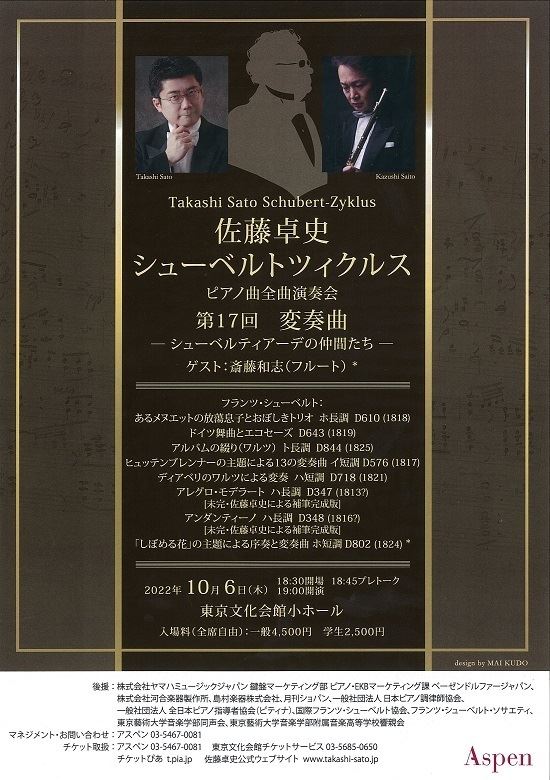 佐藤卓史シューベルトツィクルス第17回「変奏曲」 22/10/6(木) 東京文化会館 小ホール シェア ツイート シューベルト国際コンクール優勝の佐藤卓史によるシューベルトピアノ曲全曲演奏会。 公演情報 ジャンル ピアノ・鍵盤楽器 料金 全席自由 一般-4,500円 全席自由 学生-2,500円 表示できるチケット情報はありません詳しくはこちら キャスト&スタッフ ピアノ 佐藤卓史 フルート 斎藤和志 お問い合わせ アスペン シェア ツイート