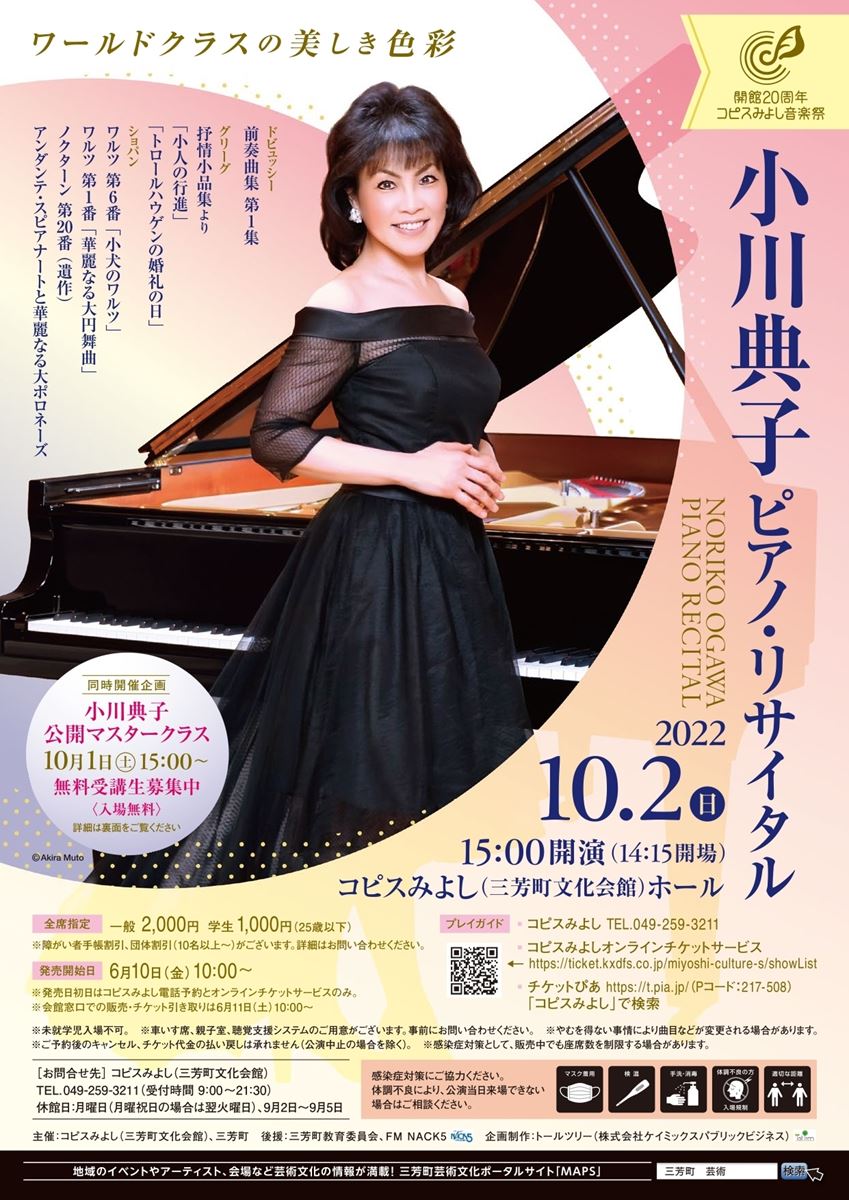 小川典子 ピアノ・リサイタル 22/10/2(日) コピスみよし(三芳町文化会館) シェア ツイート ロンドンと東京を拠点に、世界中で活躍するピアニスト小川典子。ドビュッシー、グリーグ、ショパンの名曲を美しい色彩感でお届けします。ワールドクラスの音楽に触れられるチャンスです。 公演情報 ジャンル ピアノ・鍵盤楽器 未就学児童は入場不可。 料金 全席指定 一般-2,000円 全席指定 学生(小学生~大学生)-1,000円 全席指定 学生(小学生~大学生)-公演当日要学生証 表示できるチケット情報はありません詳しくはこちら キャスト&スタッフ ピアノ 小川典子 お問い合わせ コピスみよし 公式サイト シェア ツイート