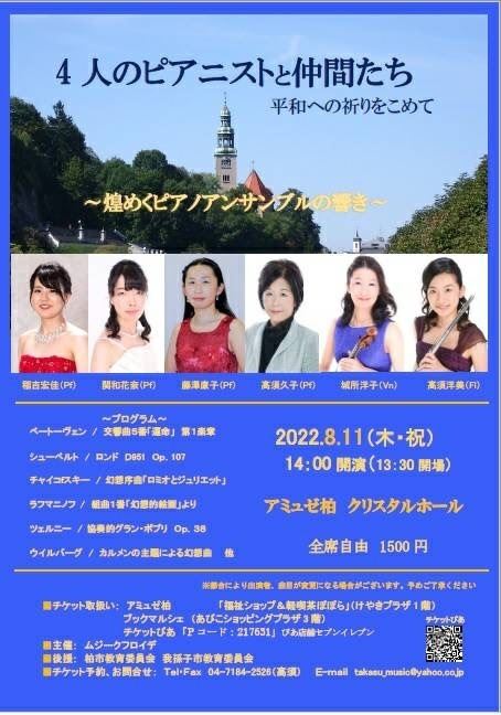 4人のピアニストと仲間たち 22/8/11(木) アミュゼ柏 クリスタルホール シェア ツイート 4人のピアニストによる煌びやかなピアノアンサンブルの響き 公演情報 ジャンル 室内楽 ピアノ・鍵盤楽器 料金 全席自由-1,500円 表示できるチケット情報はありません詳しくはこちら キャスト&スタッフ 出演 稲吉宏佳 関和花奈 藤澤康子 高須久子 城所洋子 高須洋美 お問い合わせ ムジークフロイデ高須 シェア ツイート