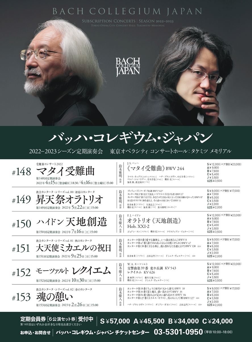 バッハ・コレギウム・ジャパン 第151回定期演奏会 22/9/25(日) 東京オペラシティ コンサートホール:タケミツメモリアル シェア ツイート 秋のカンタータ〜大天使ミカエルの祝日〜 公演情報 ジャンル 声楽 未就学児童は入場不可。 料金 S席-9,000円 A席-7,000円 B席-5,000円 C席-3,500円 J席-2,000円 表示できるチケット情報はありません詳しくはこちら キャスト&スタッフ 指揮 鈴木雅明 合唱・管弦楽 バッハ・コレギウム・ジャパン ソプラノ 松井亜希 テノール 吉田志門 バス ドミニク・ヴェルナー お問い合わせ バッハ・コレギウム・ジャパン 公式サイト シェア ツイート