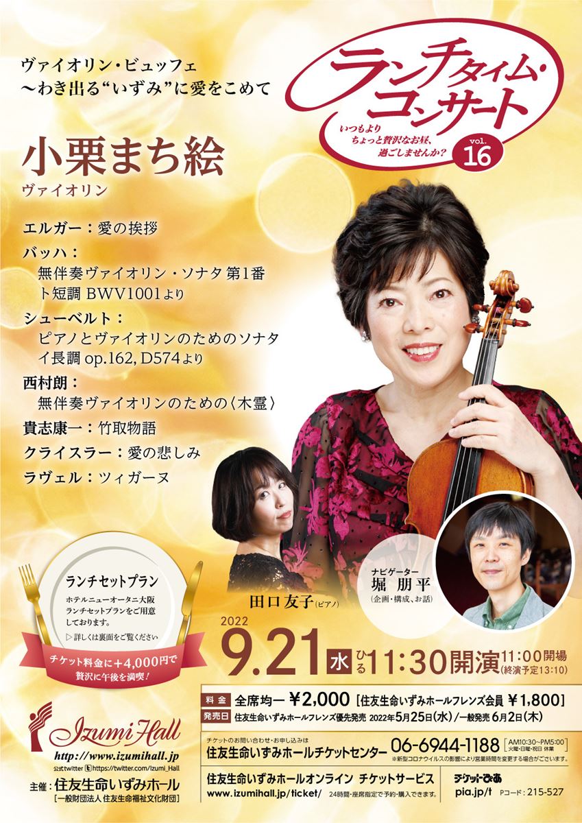 ランチタイム・コンサート Vol.16 小栗まち絵(ヴァイオリン) 22/9/21(水) 住友生命いずみホール シェア ツイート ヴァイオリン・ビュッフェ~わき出る“いずみ”に愛をこめて 公演情報 ジャンル 室内楽 器楽 ランチセット・プランは取扱いなし。未就学児童は入場不可。 料金 指定席-2,000円 表示できるチケット情報はありません詳しくはこちら キャスト&スタッフ 出演 小栗まち絵 田口友子 堀朋平 お問い合わせ いずみホールチケットセンター 公式サイト シェア ツイート