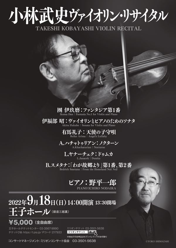 小林武史ヴァイオリン・リサイタル 22/9/18(日) 王子ホール シェア ツイート 團伊玖磨:ファンタジア第1番/伊福部昭:ヴァイオリンとピアノのためのソナタ/有馬礼子:天使の子守唄/ハチャトゥリアン:ノクターン/ヤナーチェク:ドゥムカ/スメタナ:「わが故郷より」第1番、第2番 公演情報 ジャンル 室内楽 器楽 料金 全席自由-5,000円 表示できるチケット情報はありません詳しくはこちら キャスト&スタッフ ヴァイオリン 小林武史 ピアノ 野平一郎 お問い合わせ (株)ミリオンコンサート協会 公式サイト シェア ツイート