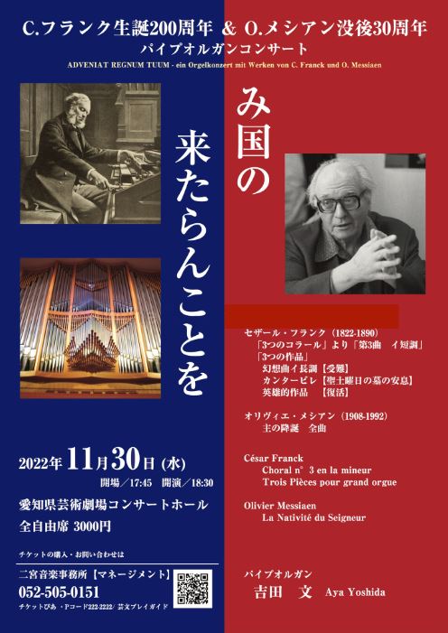 吉田文(porg) 22/11/30(水) 愛知県芸術劇場 コンサートホール シェア ツイート C.フランク生誕200周年 & O.メシアン没後30周年。パイプオルガンコンサート「み国の来たらんことを」 公演情報 ジャンル 室内楽 器楽 未就学児童は入場不可。 料金 自由席-3,000円 表示できるチケット情報はありません詳しくはこちら キャスト&スタッフ 出演 吉田文 お問い合わせ 二宮音楽事務所 シェア ツイート